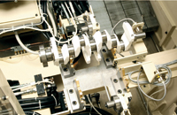 通过机内装载机将工件搬送到测量工位,通过超硬滚轮的摩擦驱动使曲轴旋转。直列3缸曲轴以No.1,4主轴颈为支撑、直列4缸曲轴以No.1,5主轴颈为支撑进行平衡测量。针对3缸非对称曲轴可实现无配重测量,因此使得4缸曲轴和3缸曲轴间的随机生产成为可能。